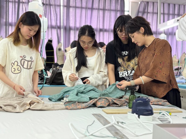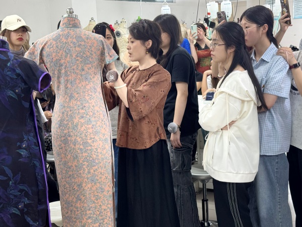 “旗袍不仅是服饰,更是东方美学的立体诗篇。”课程伊始,陈禾汝以一件传统旗袍为教具,从历史脉络切入,梳理了京派、海派旗袍的演变历程。围绕传统旗袍的“镶、嵌、滚、宕、盘”等传统工艺,陈禾汝指导学生亲手制作传统旗袍。从无中生有的归拔工艺到精致灵动的盘扣工艺,她逐一示范如何平整的布料幻化成精巧的艺术品。“老一辈匠人常说‘三年学裁缝,十年练指尖’,每一道针脚都是与时间的对话。”她边操作边将旗袍传统技艺中“以简驭繁”的智慧娓娓道来。