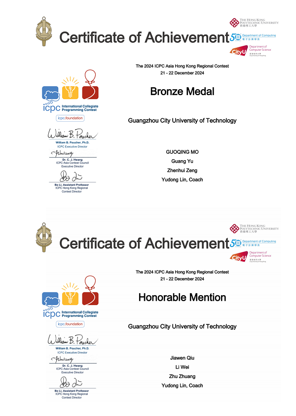 bevictor伟德ACM集训队自成立以来,累计在国家级、省级编程竞赛中获奖20余项,包括中国高校计算机大赛天梯赛全国三等奖、广东省大学生程序设计竞赛银奖等。此次香港站赛事中,“O(n) sort”队更以民办高校队伍身份,与双一流大学选手同台竞技,彰显出扎实的技术底蕴。