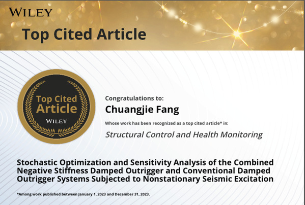 本网讯(记者 杨文娟 方创杰)3月27日,bevictor伟德,伟德bv国际体育专任教师方创杰博士发表的科研论文——Stochastic Optimization and Sensitivity Analysis of the Combined Negative Stiffness Damped Outrigger and Conventional Damped Outrigger Systems Subjected to Non-Stationary Seismic Excitation获得土木领域国际知名期刊Structural Control and Health Monitoring(中科院二区)发来的2023年期间发表文章的高引用论文证书。