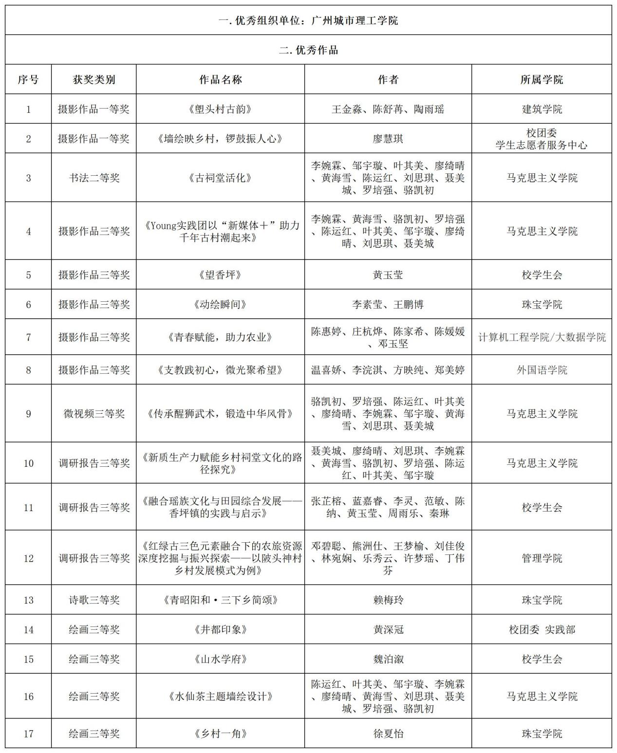 自活动启动以来,校团委认真组织、积极宣传策划,引导青年学生充分挖掘广东乡村历史记忆和乡村振兴实践成果,通过开展社会调研、思政教育,助力广东省“百县千镇万村高质量发展工程”深入实施。2024年“多彩乡村 共谱新篇”系列实践活动主办方共收到各类作品15216件,经专家严格评审,评选出2469件优秀作品,105个优秀组织单位。此次获奖不仅是学校师生深入乡村、体验生活、用心创作的成果,而且也是学校坚持教育与实践相结合,落实“百千万工程”、推动乡村文化振兴的生动实践。