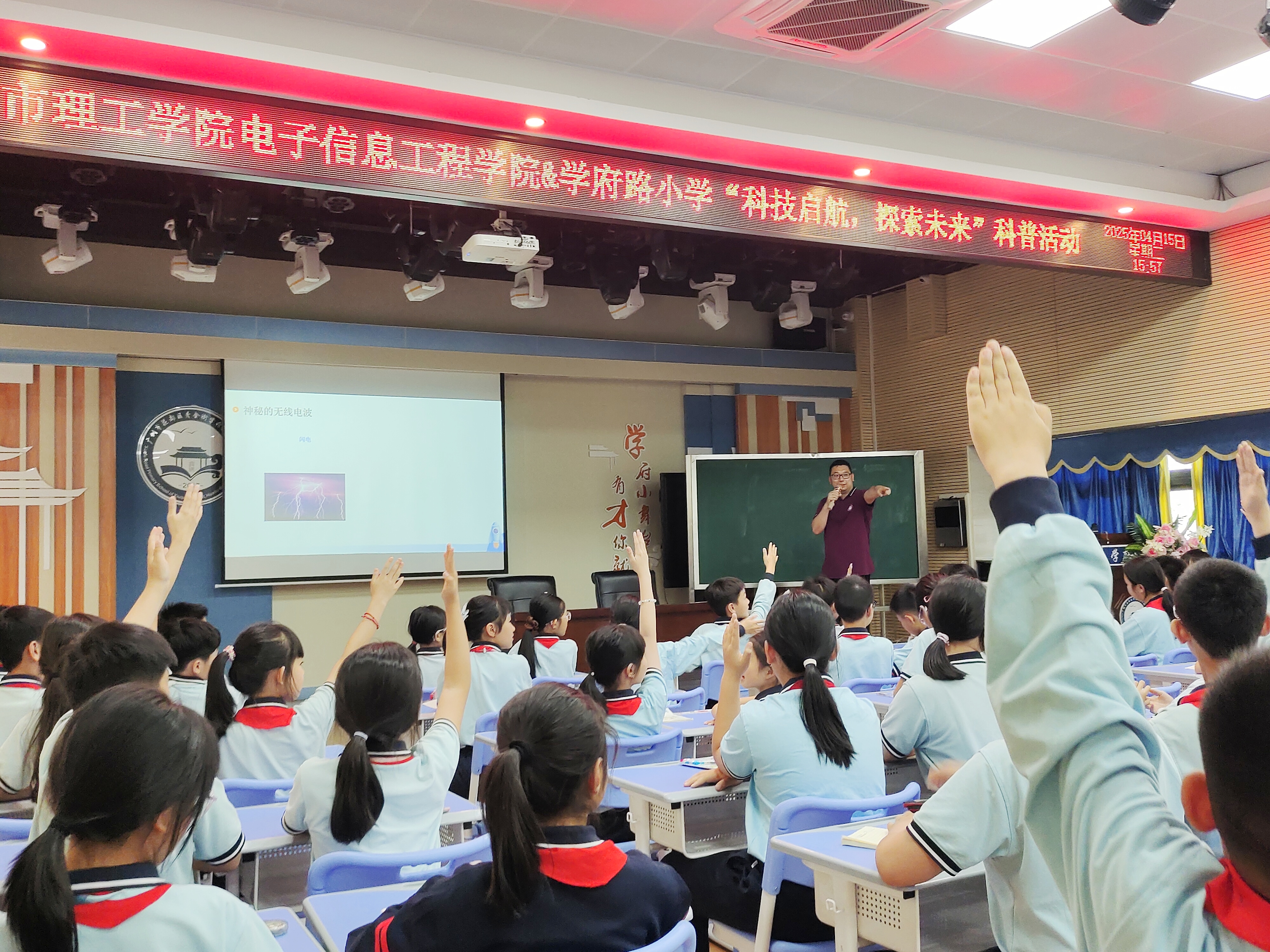 签约仪式结束后,在学府路小学多功能厅,bevictor伟德无线电测向队指导教师张亦勋为五年级的学生带来了一场无线电波科普课堂。他以“看不见的空中信使”为切入点,通过动画演示、摩尔斯电码互动游戏和简易测向仪实操,诠释了无线电波的产生、传播与应用原理。课堂特别设置“科学盲盒”问答环节,学生们争相参与讨论。