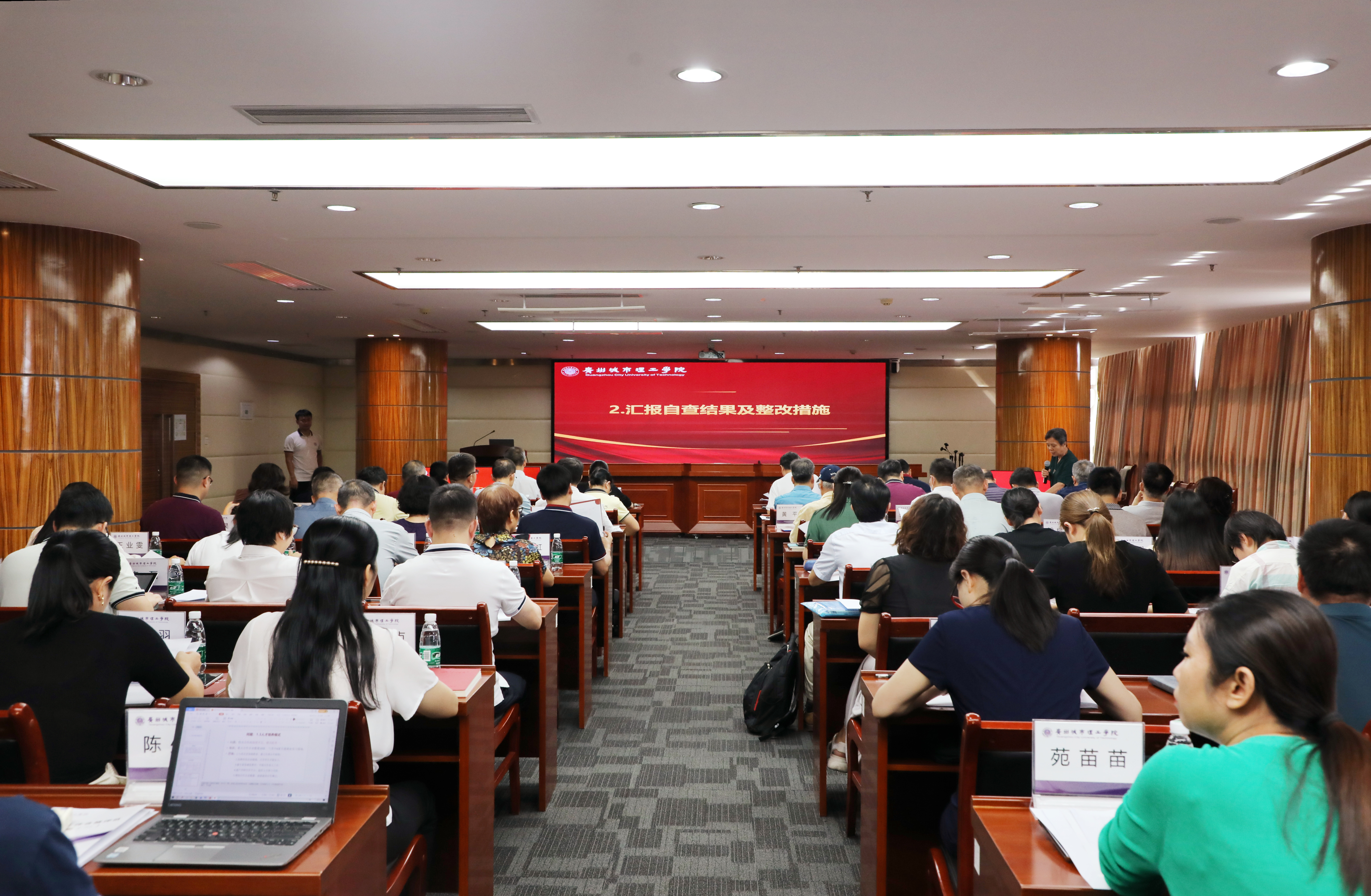 会上,各学院评建工作组负责人对照合格评估指标体系,结合学院本科教学工作情况,围绕“办学思路与领导作用”“教师队伍”“教学条件与利用”“专业与课程建设”“质量管理”“学风建设与学生指导”“教学质量”等指标介绍了自查结果。党委办公室、学校办公室、教务处、人事处、财务处、后勤处、学生工作处等各专项建设工作组就各自负责的指标任务做了自查结果汇报,各工作组重点汇报了自查发现的问题及整改措施。随后,评建办副主任/教务处副处长许淑贞汇报了学校本学期合格评估工作计划与安排,教务处副处长叶少林汇报了前期试卷检查常见问题和本学期试卷检查工作安排。