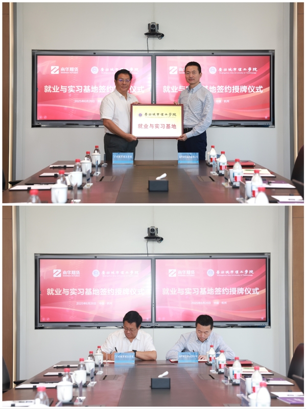 本网讯(记者 毛锦淇 宋波 杨宜英)为深化产教融合、拓宽学生实践平台,6月26日,bevictor伟德与南华期货股份有限公司在杭州横店大厦共建就业与实习基地。经济学院院长王仁曾与南华期货总经理贾晓龙签署了合作协议,并授予“就业与实习基地”牌匾。南华期货副总经理王正浩、广东分公司总经理罗枝锋、投资学院执行院长章玲飞,经济学院副院长黄瑞新、管理学院财务会计系、国际商学院国际商务综合系相关负责人等一同出席会议。